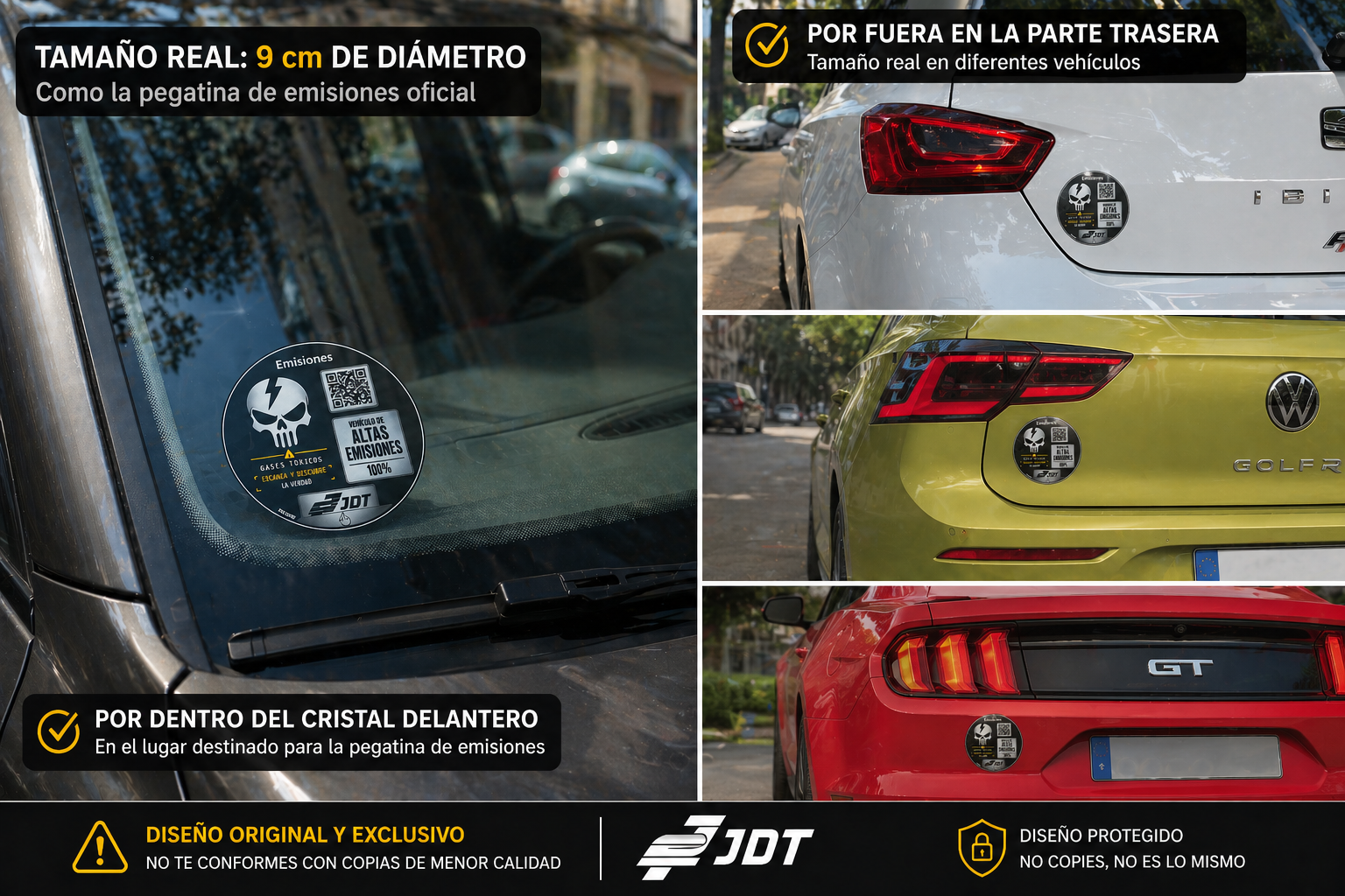 - Tamaño real: 9 cm de diámetro (igual que la pegatina de emisiones oficial)